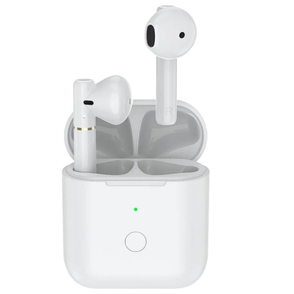 Наушники TWS SARMA выполнены в виде вкладышей белого цвета и обеспечивают удобную посадку в ушных раковинах. Устройство поставляется в защитном кейсе, который также служит целям зарядки благодаря встроенному аккумулятору.