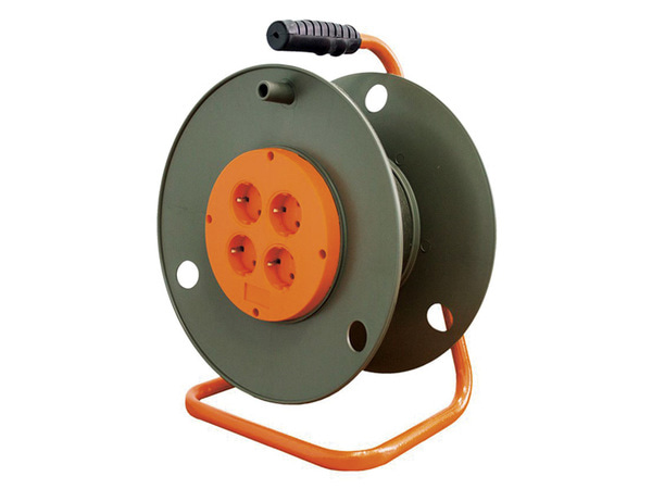 Катушка без провода с 4 встроенными розетками с заземлением применяется для хранения и транспортировки кабеля в удобном и компактном виде. Позволяет быстро развертывать и свертывать провод при помощи специальной намоточной ручки, находящейся с торца. Используется дома, на даче, в гараже, на объекте при отделочных работах, в цеху на производстве и т. д. Изделие оснащено устойчивой металлической опорой, практичной ручкой для переноски и устройством для быстрого сматывания шнура питания удлинителя. Имеет контакты заземления и степень защиты IP20.