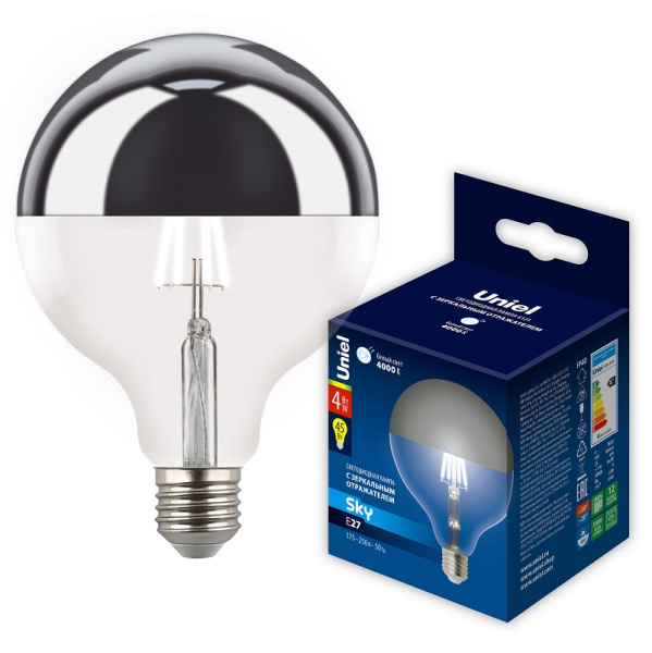 Лампа светодиодная форма шар LED-G125-4W-4000K-E27-CL MIRROR-CHROME PLS02WH прозрачная колба с зеркальным отражателем. Серия Sky. Белый свет 4000K ТМ Uniel