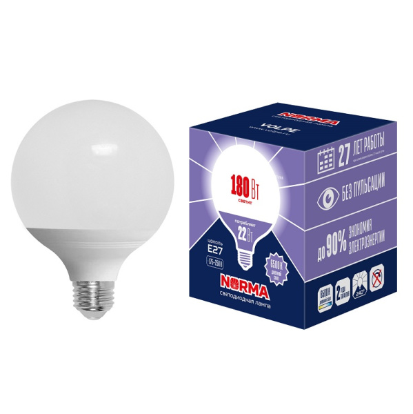 Лампа светодиодная LED-G120-22W-6500K-E27-FR-NR форма шар, матовая. Серия Norma дневной белый свет 6500K ТМ Volpe