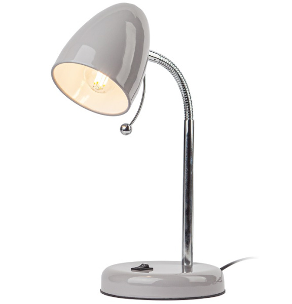 Настольный светильник N-116-Е27-40W-GY с цоколем Е27 компактного размера для удобного размещения на столе. Может использоваться с лампой накаливания, компактной люминесцентной лампой (КЛЛ) или светодиодной (LED) лампой. У светильника металлические стойка и плафон, выключатель на основании. Высота расположения плафона регулируется сгибающейся стойкой, направление света - наклоном и поворотом плафона в любом направлении.
