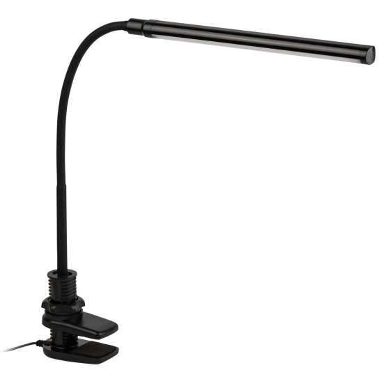 Настольный светильник со светодиодами (LED) в качестве источников света, 8 Вт. Модель на струбцине с сенсорным переключателем на плафоне. Плавная регулировки яркости. Высота плафона регулируется гибкой стойкой.