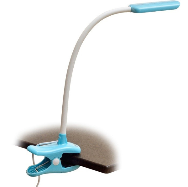 Светильник TLD-554 Blue со специальным креплением в виде прищепки. Изготовлен из пластика, оформлен в современном стиле. Прибор не занимает место на столе, а фиксируется на краю столешницы. При необходимости настольная лампа закрепляется на предметах интерьера с выступами, превращаясь в источник верхнего света. Световой поток 400 Лм при мощности светодиодов 4 Вт равносилен свету, который дает лампа накаливания на 40 Вт. Холодный свет необходим для организации рабочей атмосферы и улучшения концентрации.