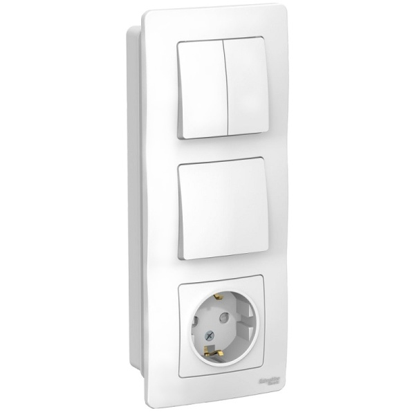 Блок 1 клавишный+2 клавишный+розетка с заземлением скрытой установки, белый предназначен для сетей до 240В. Блок удобен в применении и отлично подходит для коридора.