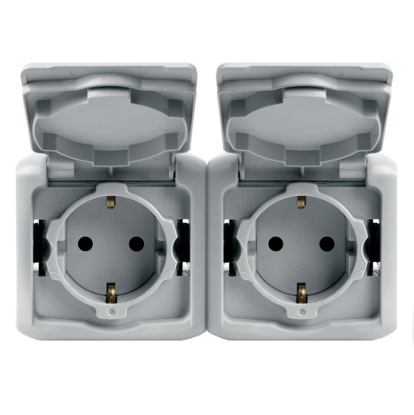 Розетка 2-ая с крышкой с заземлением с защитными шторками наружная серый 782353 Legrand Quteo влагозащищённая IP44 16A. Предназначена для внешней проводки. Степень защиты от влаги IP44 позволяет устанавливать розетку на улице или в бане. Для наружного (настенного) монтажа.