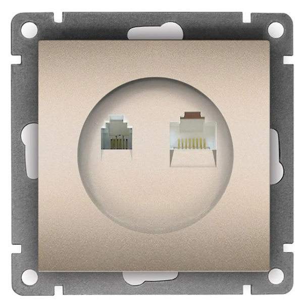 Комбинированная розетка компьютерная+телефонная шампань серия Афина A0052-Br, 1а, RJ45, RJ12, еврослот позволяет совмещать подключение одновременно компьютера и телефона, идеально подходит для установки в офисных помещениях. Представляется без рамки.
