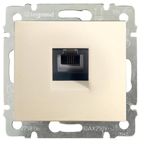 Телефонная розетка RJ11 Legrand Valena 774338 служит для подключения к сетям телекоммуникаций, например, к телефонным сетям общего пользования. Используется для скрытой проводки. Накладка из термопласта кремового цвета позволяет оформить комнату в одном стиле. Механизм изготовлен из металла, он обладает износостойкостью и безопасностью применения. Особенности: - Присоединение телефонного кабеля к розетке не требует специального инструмента. Надежность контактов обеспечивается техникой быстрого соединения: поворотом самозачищающих клемм на 1/4 оборота; - Конструкция предусматривает возможность параллельного соединения двух и более розеток; - Лицевая панель изготовлена из прочного глянцевого поликарбоната, стойкого к механическим воздействиям, выгоранию и загрязнениям. Способ монтажа – поворот контактного механизма на 1/4 оборота. 4 контакта, 1 выход. С самозачищающимися контактами. Рамки поставляются отдельно.