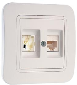 Розетка для интернета и телефона Makel Lillium с двумя разъемами (RJ45, RJ11) для встроенного монтажа в сборе, цвет белый, предназначена для подключения телефона и компьютерной или периферийной техники. Розетка имеет один компьютерный выход стандарта RJ45 (8 контактов), который соответствует категории 5e и обеспечивает передачу данных со скоростью 100 Мбит/с и один телефонный разъём стандарта RJ11 (4 контакта). Соответствует единым нормам и стандартам связи. Конструкция гарантирует плотную посадку контактов.