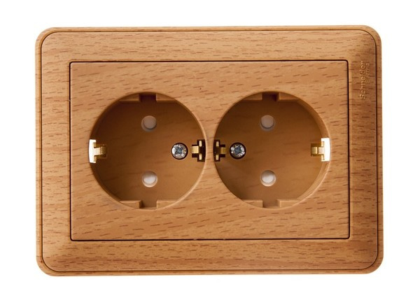 Розетка Schneider Electric W59 (в сборе, цвет бук) двойнаяс заземлением и шторками подходит для сетей 250В, на ток 16А.
